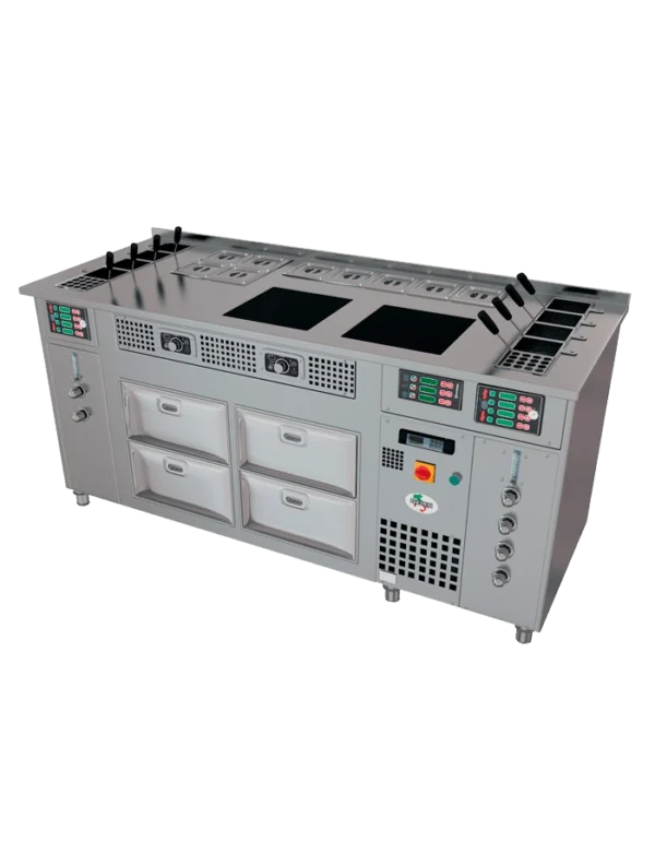 Ce comptoir comprend : 8 paniers cuiseurs à pâtes, 5 x GN1/6 bacs bains-marie, 4 x GN1/6 bacs réfrigérés et 2 plaques à induction.