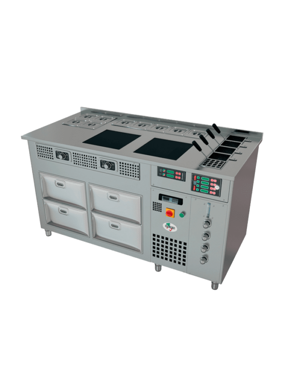 Ce comptoir comprend : 4 paniers cuiseurs à pâtes, 5 x GN1/6 bacs bains-marie, 4 x GN1/6 bacs réfrigérés et 2 plaques à induction.