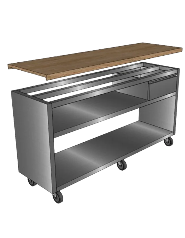 Structure en inox renforcé, montée sur 6 roulettes dont 2 avec freins. Son plateau est en bois de sapin massif certifié contact alimentaire.